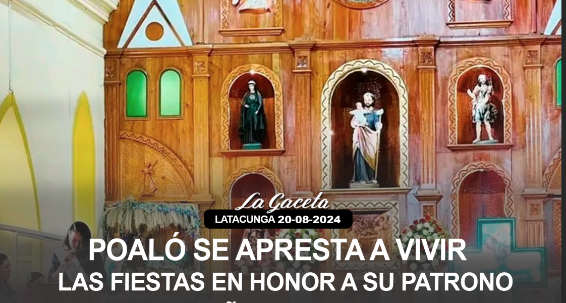 Poaló, una de las parroquias más antiguas del cantón Latacunga, está próxima a vivir la fiesta en honor a su patrono “El Señor de Maca”, las actividades previstas se vivirán entre el 24 de agosto al 15 de septiembre de 2024, con la realización de una serie de eventos artísticos, religiosos, culturales, deportivos, toros populares, […]